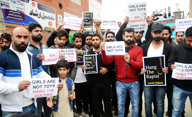 SRINAGAR, May 11: Scores of people today held a protest against the rape of a three-year-old girl in North Kashmir’s Bandipora district.