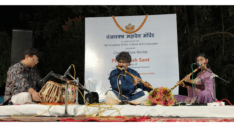 JAMMU, Oct 9: The internationally acclaimed flautist Pt Santosh Sant captivated the audience with his divine flute recital during a musical event held at Panjvaktar Mahadev Mandir.