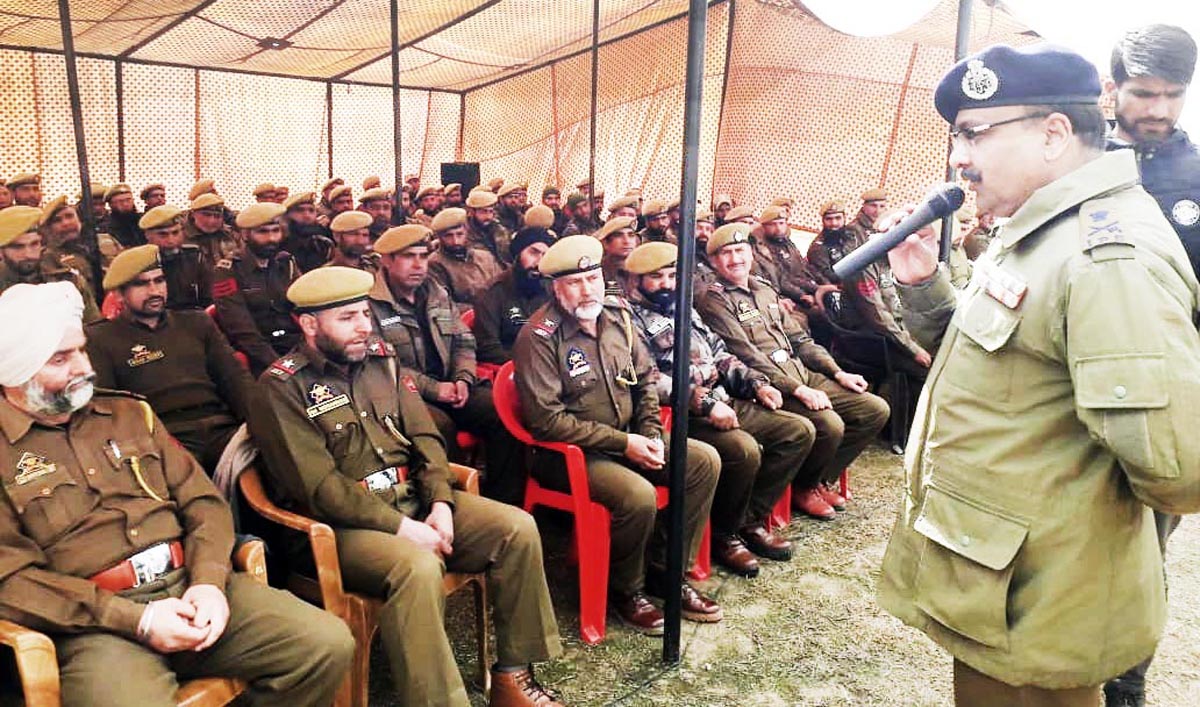DGP Dilbagh Singh addressing jawans at DPL Pulwama.