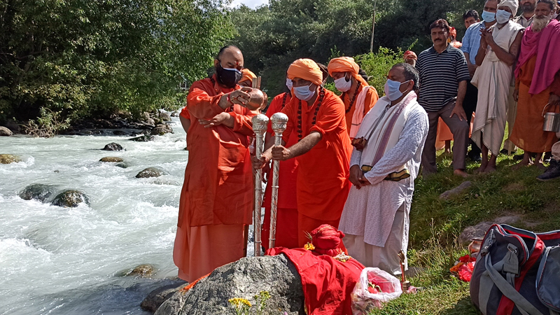 JAMMU, Aug 14: Annual pilgrimage of Chhari-Mubarak Swami Amarnath Ji culminated today at Pahalgam with its last rituals ‘Pujan’ & ‘Visarjan’, which were performed at the bank of river Lidder. Group of Sadhus and pilgrims who had come from various parts of the country joined the Pujan. Later, ‘Karri-Pakouri’ Bhandara was organized and ‘Dakshina’ was offered to them.