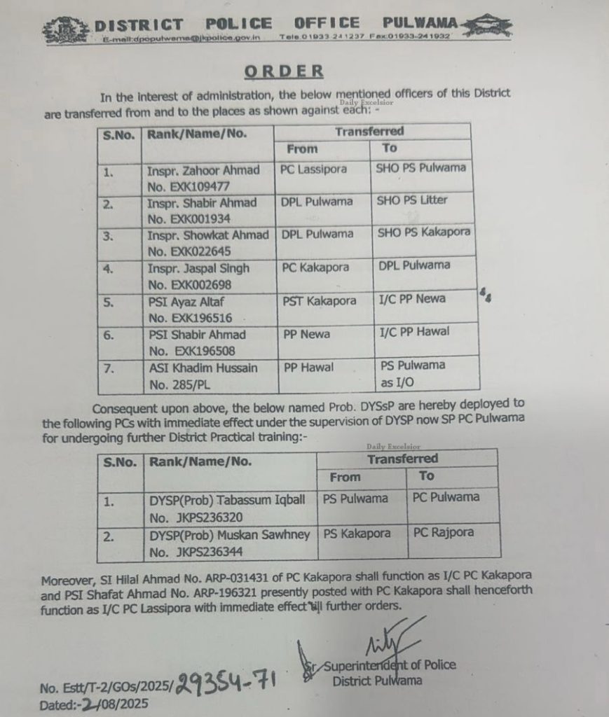 Pulwama: 2 Prob. DySPs, 4 Inspectors Among 9 Police Officers Transferred By Daily Excelsior - August 2, 2025 Share FacebookTwitterWhatsAppPinterestLinkedinCopy URLTelegramEmailTumblrReddItPrintKoo SRINAGAR, Aug 2: The Senior Superintendent of the Police (SSP) Pulwama has ordered the transfers and postings of 9 police officers. Among them are two Probationer DySP, 4 Inspectors, two PSIs, and one Head Constable. Follow our WhatsApp channel
