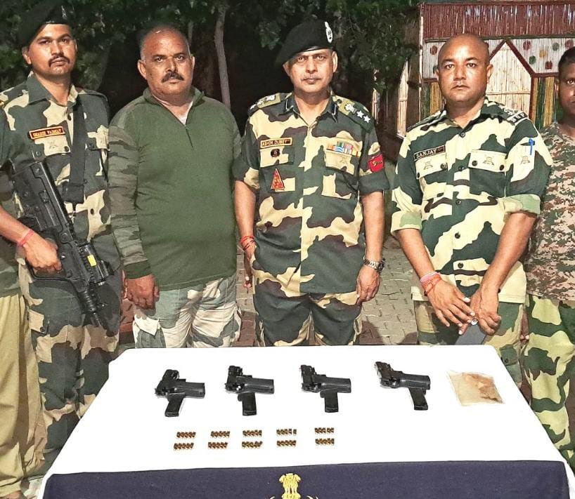 Jalandhar, Jul 18: Four Chinese pistols and 50 rounds of Pakistan manufactured live bullets were recovered by the Border Security Force from along the India-Pakistan International Border in Punjab on Thursday.