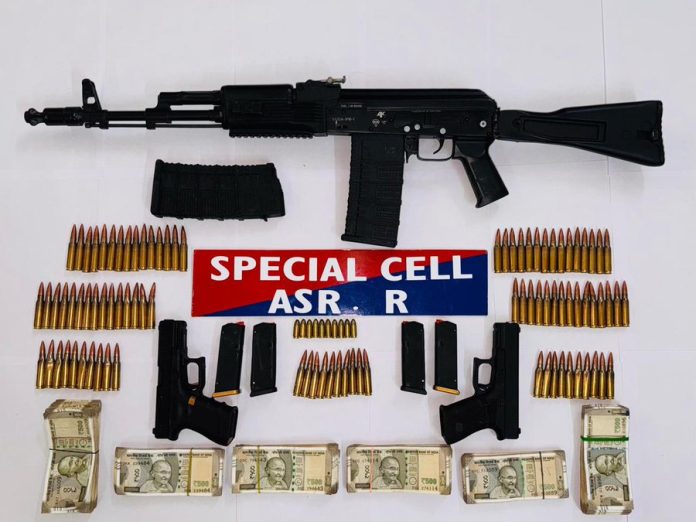 Police have seized an AK Saiga 308 assault rifle, two magazines, two 9 mm Glock pistols with four magazines, 90 live cartridges of AK rifle, 10 live pistol cartridges, Rs 7.50 lakh in cash, a car and three mobile phones from the possession of the accused.