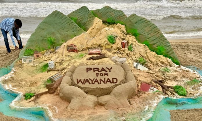 PURI, AUG 01 :-Sand artist Sudarsan Pattnaik created a sand sculpture on the landslides in Wayanand with the message ‘Pray for Wayanad’, at Puri beach in Odisha on Thursday.UNI