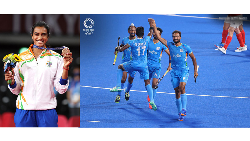 PV Sindhu reacts after winning bronze medal while hockey players celebrate victory over Great Britain to enter semifinals at Tokyo on Sunday.