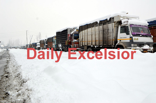 QAZIGUND: Loaded trucks stuck on 300 km Jammu–Srinagar National Highway as traffic was suspended due to snowfall which started from last night at Qazigund on Thursday after fresh snow fall changed the natural view at South Kashmir’s Anantnag district and everything is covered with white layer of snow on Thursday morning. Heavy snowfall in Kashmir valley spread a cold wave here with most places in the state recording sub-zero temperatures. Excelsior/ Sajad Dar