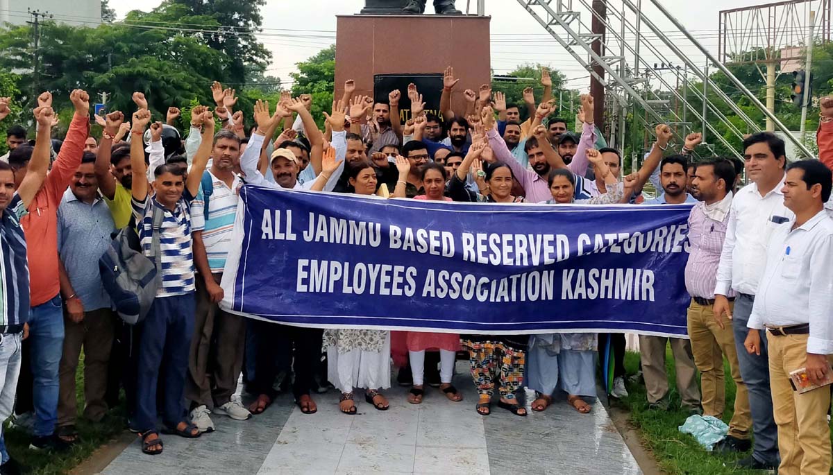 JAMMU, Sept 3: All Jammu Based Reserved Category Employees Association (AJBRCEA), Kashmir continued their protest on the 95th consecutive day at Dr BR Ambedkar Chowk here, in Jammu.