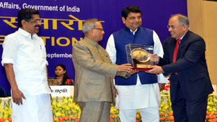 R.S. Mina, Director (Personnel), NHPC receiving first prize under Indira Gandhi Rajbhasha Award programme for commendable work in implementation of Rajbhasha from President of India Pranab Mukherjee in the presence of Mullappally Ramachandran, Union Minister of State for Home Affairs and R.P.N Singh, Union Minister of State for Home Affairs.