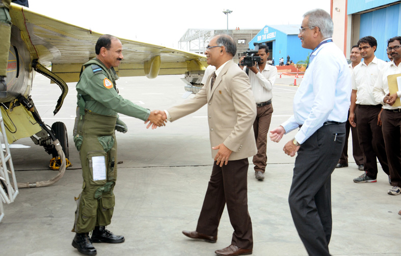 The Chief of the Air Staff, Air Chief Marshal Arup Raha being greeted by the HAL Chairman and Managing Director (CMD), Shri T. Suvarna Raju after getting down from Light Combat Aircraft (Tejas), at HAL Bangalore on May 17, 2016.