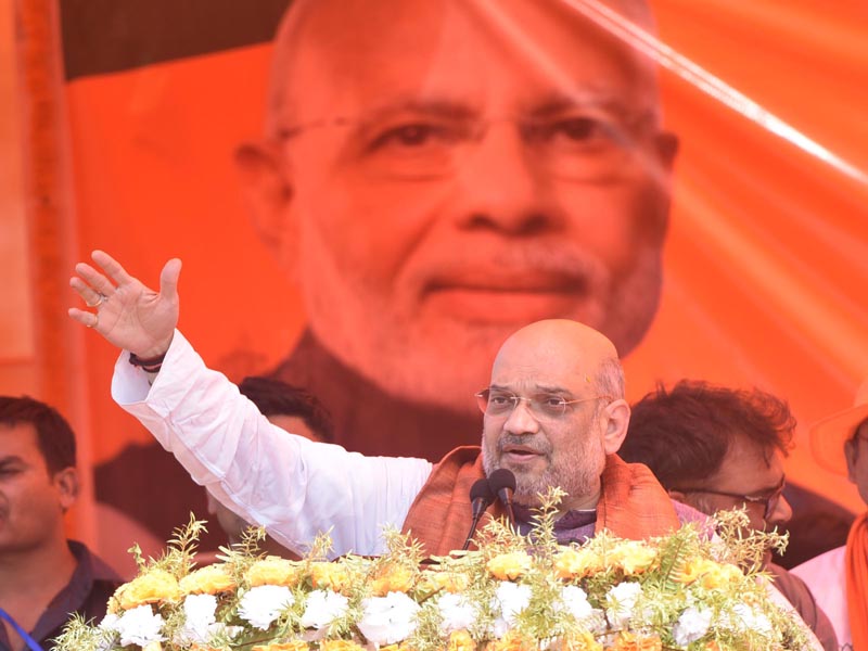 Shah was here campaigning for the JD(U) candidate Rajiv Ranjan alias Lalan Singh, a state minister and close aide of Nitish Kumar. Shah began his 25-minute speech with an exhortation to the public to chant Bharat Mata Ki Jai saying it must be loud enough to be heard in the neighbouring state of Jharkhand where Prime Minister Narendra Modi is camping. (PTI)