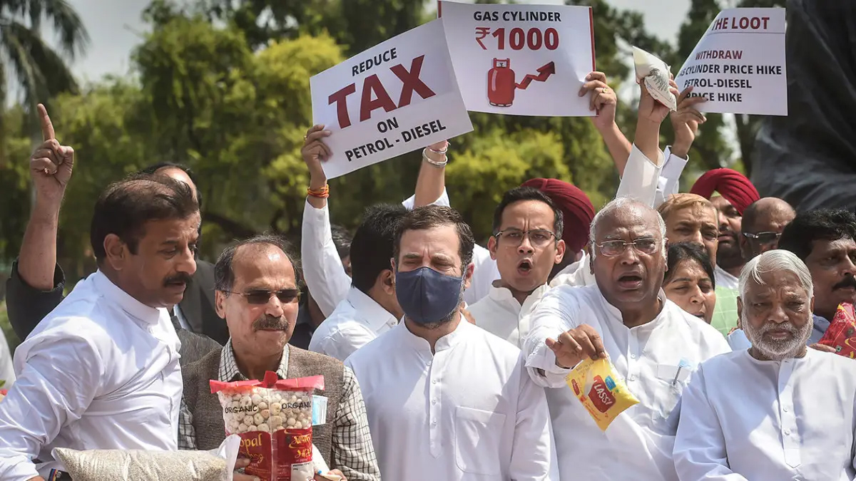 Congress leaders Rahul Gandhi, Mallikarjun Kharge, Adhir Ranjan Chowdhury and others were present during the protest in front of Mahatma Gandhi’s statue on Parliament premises. Congress and other parties have been seeking a discussion in Parliament on the issue of inflation and GST rates.