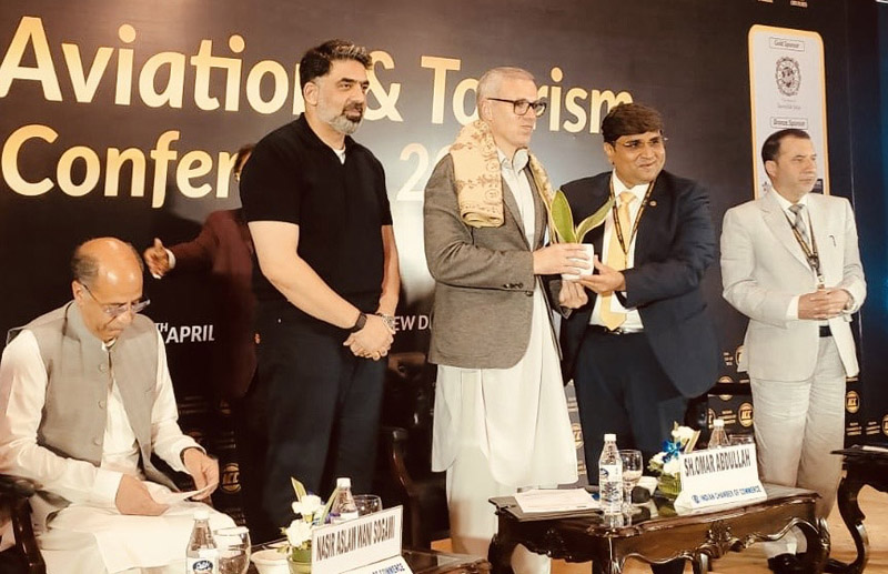 NEW DELHI, Apr 14: Rahul Sahai, Chairman of the Indian Chamber of Commerce (ICC) Jammu Chapter, felicitated Chief Minister Omar Abdullah, with a traditional shawl and a sapling, symbolizing respect and sustainability, at the prestigious ICC Aviation & Tourism Conclave 2025, held at Hotel Le Meridien, New Delhi.