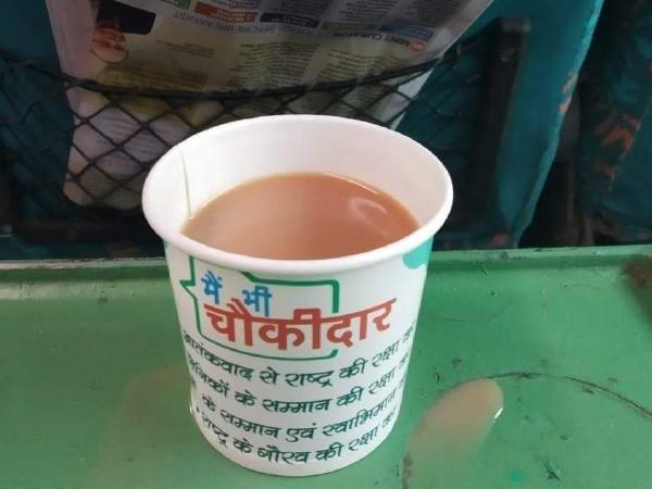 NEW DELHI : The Railways found itself caught on the wrong side of the model code of conduct yet again when passengers on Friday reported that tea was being served in paper cups with “main bhi chowkidaar” (‘I’m also watchman’) written on them.