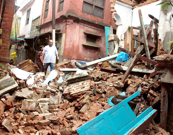 The heavy rain since last night has claimed at least four lives so far while over a dozen houses have collapsed including a school in old city area. A long wall of a factory collapsed in Bari Brahmana area early morning today while an old house in Kalijani area of Jammu city housing a private school also collapsed. No loss of life was reported in the building collapse but property worth lakhs was damaged.