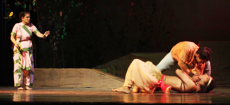 The impressive acting by duo of Balwinder Singh as Madhav and Meera Tapasavi as Mrignaini came out as a piece de résistance of today’s play. Exhibiting versatility in speech and dance, both actors played as complementary to each other, thus creating a synchronization that led to a kind of ‘chamatkar’, and consummation of ‘rasa’.