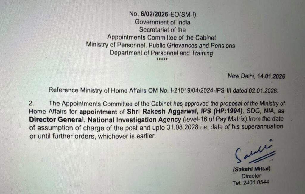 Srinagar, Jan 14: The Appointments Committee of the Cabinet (ACC) has approved the appointment of Shri Rakesh Aggarwal, IPS, as the Director General of the National Investigation Agency (NIA), according to an official order issued on Wednesday.