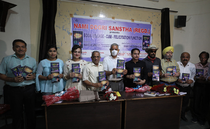 Rakesh Anand’s books being released by Nami Dogri Sanstha at Jammu on Saturday. -Excelsior/Rakesh