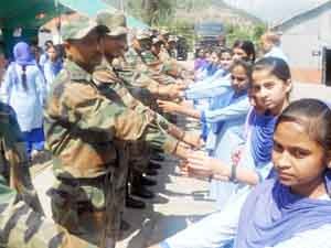 Students of Bharatiya Vidya Mandir (BVM) High School Ramban celebrated Rakshan Bandhan with the Army Jawan at RR 23 and 109 INT Bn (TA) at Maitra Camp. Girl students accompanied by Principal Pardeep Singh Thakur and staff members tied Rakhies on the wrists of the saviours of the nation.