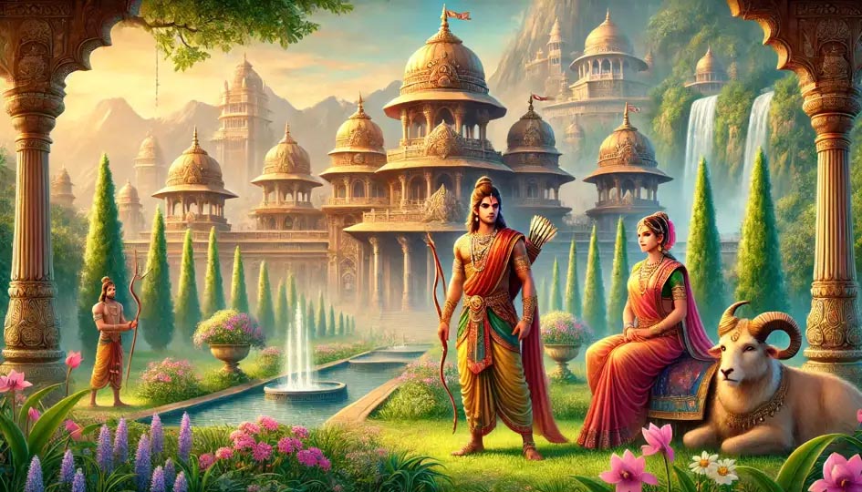(Sita was) adorned with diverse jewellery and a beautiful palanquin was brought (to her). The Princess of Videh (Sita) gladly climbed into it, recalling Lord Ram.