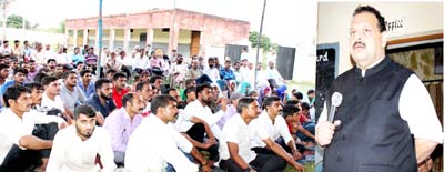 NC Provincial President Devender Singh Rana addressing a public meeting in Nagrota constituency on Sunday.