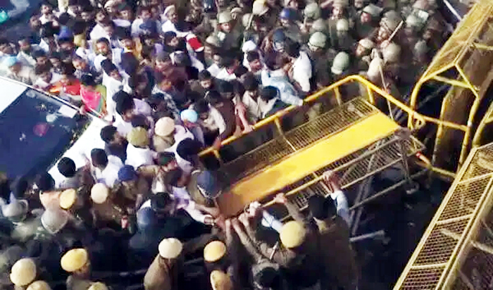 Three policemen were injured after stones were pelted at the palace’s main gate from both sides.