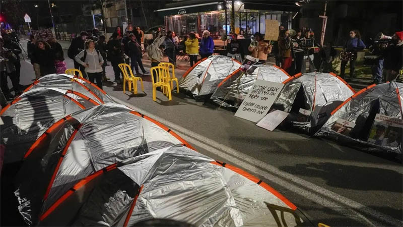 On Sunday night, family members set up a protest tent in Jerusalem and vowed to stay there until the government reaches a deal to free some hostages.