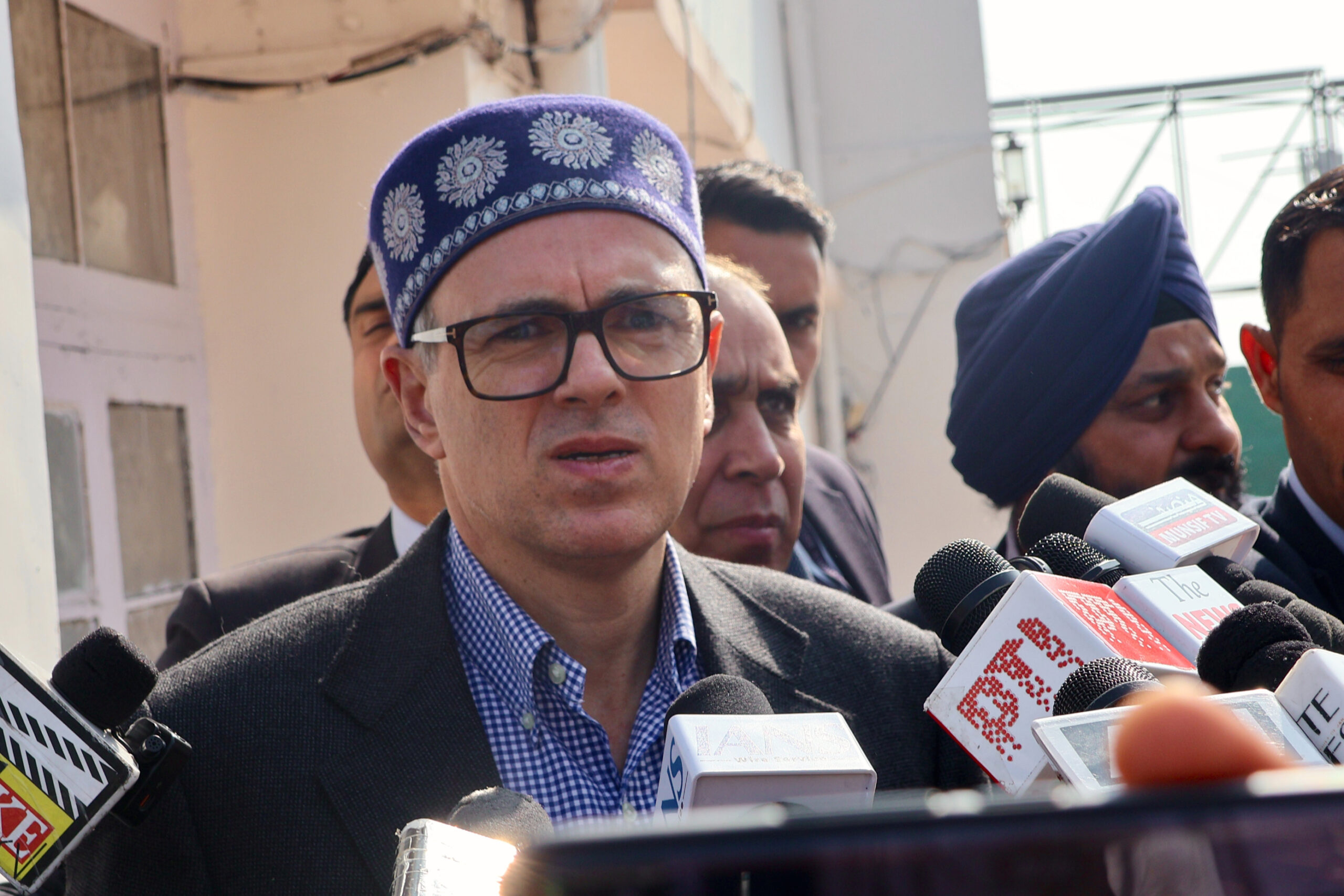 Jammu and Kashmir Chief Minister Omar Abdullah speaks to the media during the second day of the Budget Session of the Jammu and Kashmir Legislative Assembly session, in Jammu.