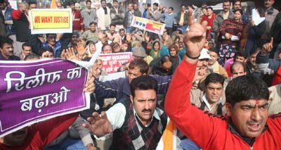 Relief holders taking out a rally in Jammu on Monday.                            —Excelsior/Rakesh