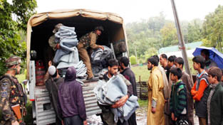 Relief material (blankets) being distributed by Indian Air Force at Air Force Station Awantipur to flood affected people in Kashmir on Monday.