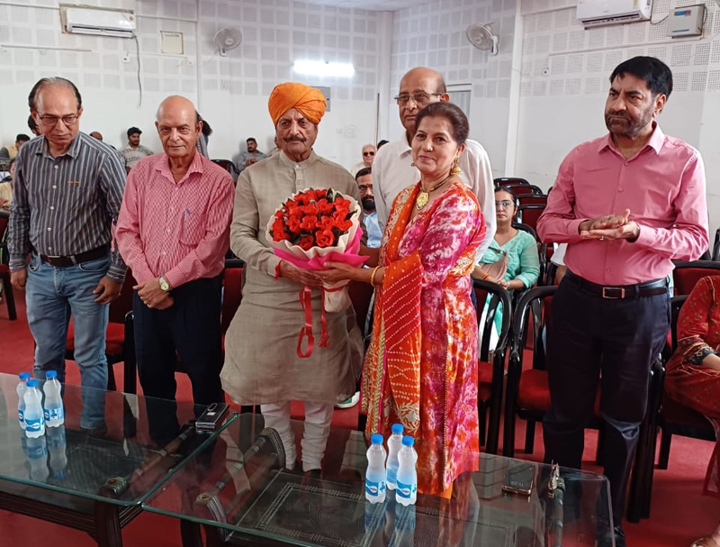 Renowned folk singer Asha Kesar receiving chief guest Gulchain Singh Charak during a function in Jammu on Sunday.