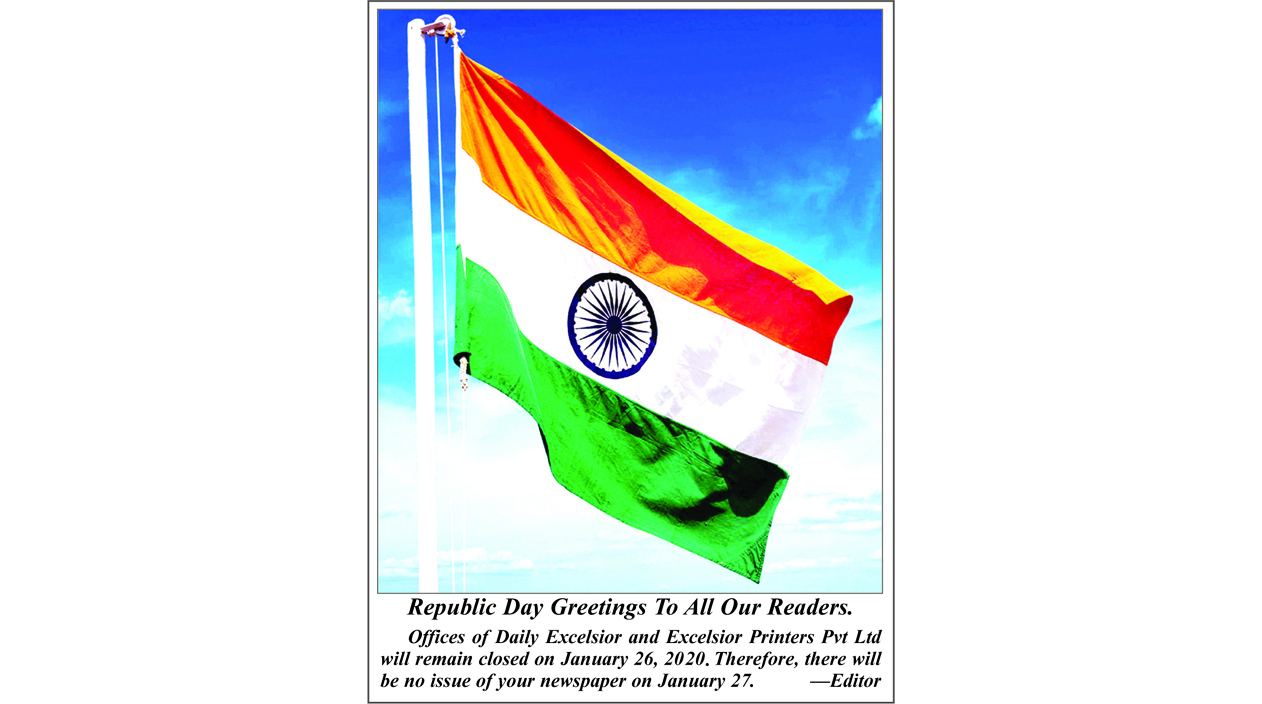 Republic Day Greetings to All Our Readers By Daily Excelsior - January 26, 2020 Share FacebookTwitterWhatsAppPinterestLinkedinCopy URLTelegramEmailTumblrReddItPrintKoo Republic Day Greetings to All Our Readers Republic Day Greetings to All Our Readers Follow our WhatsApp channel