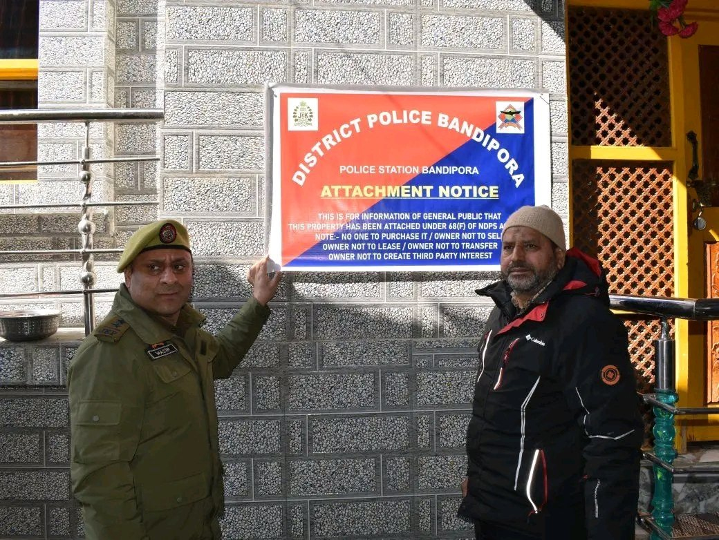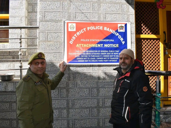 Srinagar, Feb 12: Jammu and Kashmir Police on Thursday attached a three-story residential house belonging to an alleged drug peddler in Bandipora district.