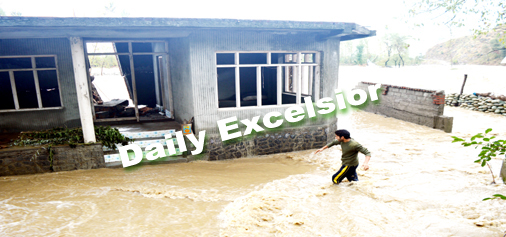 Residents flee from their houses in Laisoo Domhall area in Kashmir, which were damaged due to floods caused by incessant rains yesterday. Excelsior: Sajad Dar