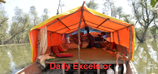 Residents of Kanyari area took shelter in boats as their houses are completely submerged in water since flood hit the area of district bandipora- Excelsior\Abid Nabi