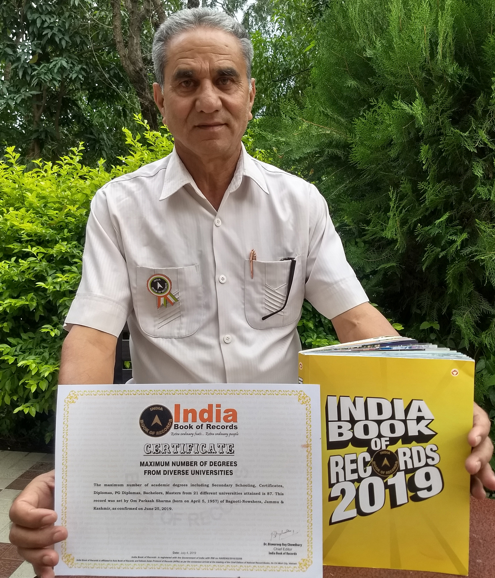 JAMMU, Oct 19: Setting an example of extreme devotion and love for education and also proving that there is no age limit for education, O P Sharma (retired AMO) of Bagnoti (Nowshera) has created a record of “maximum number of degrees from diverse universities” in India Book of National Records.