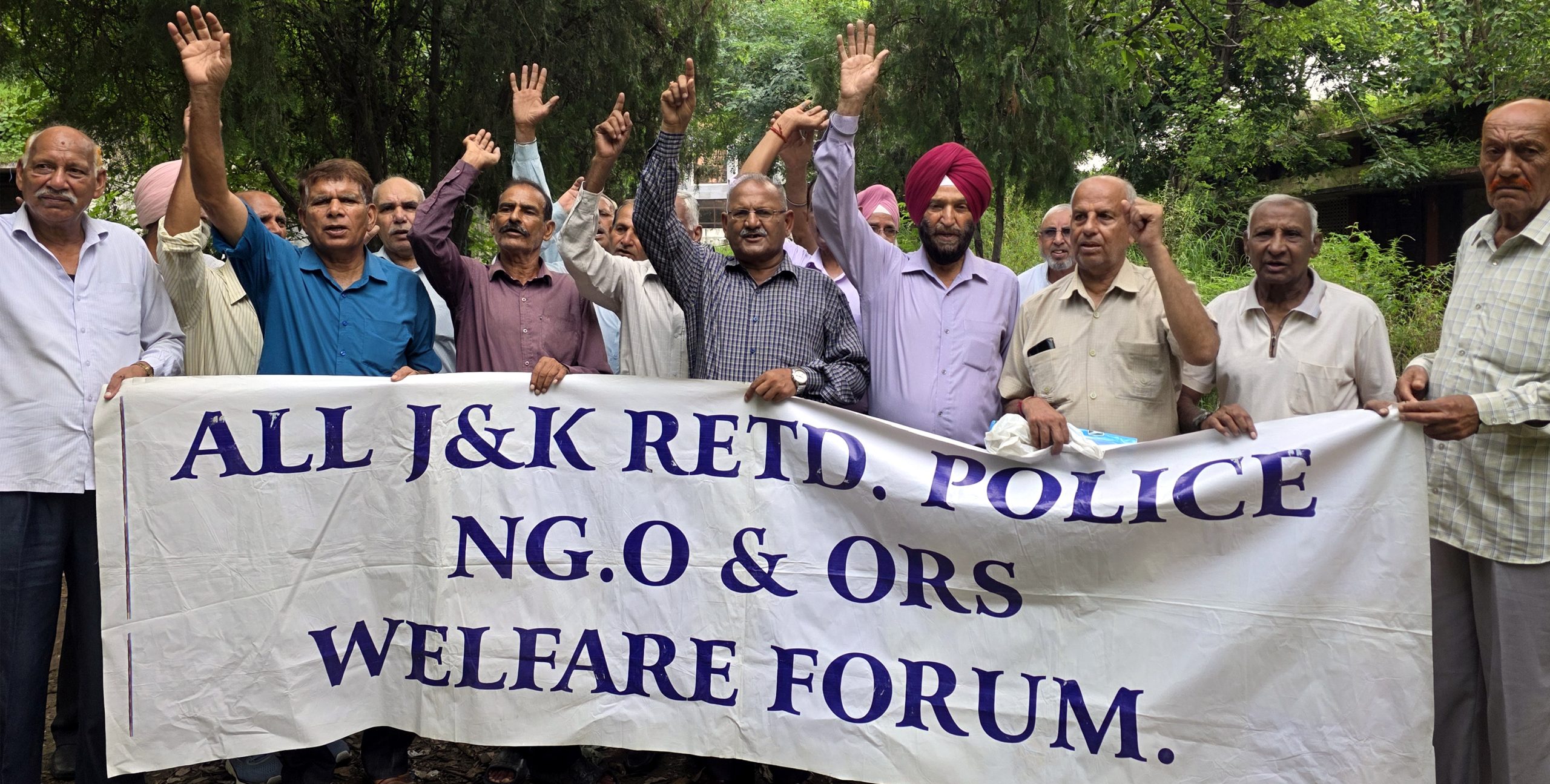 JAMMU, Aug 5: Members of the Non-Gazetted Police Pensioners Welfare Forum today held a protest at Hari Singh Park, Jammu, under the chairmanship of Ajit Singh, highlighting long-pending issues of pay anomalies and denial of benefits to retired personnel of J&K Police and Fire Services.