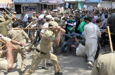 The trouble erupted soon after the protesting ReTs tried to proceed towards the Civil Secretariat. Police immediately swung into action and resorted to lathicharge on the marching ReTs. More than a dozen ReTs, including female teachers, were injured in the police action while several others were detained and taken to Nowabad Police Station.