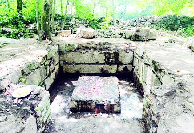 It is believed to be 5000 yrs old temple of Pandavas though authentication by archaeological survey of India is pending. The information regarding this temple has been submitted in the office of the concerned authorities and they are made aware regarding its historical significance. This temple is worshiped in the form of SHILA, which is believed to have a spring underneath the same shila.Sharda peeth, which is now in Muzafabad, PoK is the holiest pilgrimages of the Hindus and Buddhists all over the world and it holds a significant place in site for ancient universities like Nalanda and Taxila. The temple has a very interesting and well documented folktale associated with it. It is believed that Sharda script native to Kashmir is named after Goddess Sharda, the goddess of learning also represented as Saraswati. It is believed that goddess Sati’s right hand has fallen there due to which it is believed that during Sagar Manthan, a Myna commonly called as Haer in Kashmiri,took a few drops of Amrit (Nectar) in its beak and out of which one drop had fallen at VillageGugloosa from which this Shila has originated. It is also believed that there is a Kund underneath this Shila. It is mentioned in Sharda Mahimapuranm by Dr. Brij Nath Koul. After displacement of Kashmiri Pandits from the village in 1990 and due to uncertain political and security situation, the temple stands in ruins till last week. Shila was buried under the temple debris. After about 29 years the native Kashmiri Hindu families visited the temple and were disheartened to see the dilapidated state of the temple. The local Pandit families created a registered Trust for temple which is looking after the repair and renovation work of the same. The only goal is to restore it to old glory though the resources are very meagre. There are only 15 native families to this village and they have donated form their pockets for the repair work. District Kupwara administration was also contacted multiple times and have assured for the repair, for which villagers are hopeful to see the light of the day.Trust members and executive visited the site and it was decided to start the renovation work immediately. It was fascinating to observe that during the cleaning of the temple, a one legged myna was constantly monitoring the whole process as if it was supervising and rejoicing the temples’s revival. For some it might be a co-incidence or superstition but it’s a symbol of faith and hope for those who have a strong belief in Sanatan Dharma.