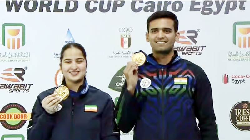 CAIRO, Jan 27: India picked up their first gold medal of the ISSF World Cup here on Saturday when Rhytham Sangwan and Ujjwal combined to defeat the Armenian pair of Elmira Karapetyan and Benik Khlghatyan 17-7 in the 10m air pistol mixed team event.