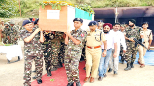 Inspector General Operational Ashok Kumar, DIG Rajinder Singh, Commandant Ajay Kumar, Commandant Sanjeev Yadav, SSP Ramban Mohan Lal, ADC Gurvinder Jit Singh, ACR Vivek Puri and officials from civil and police administration also reached there to pay rich tributes to HC Ram Parvesh Yadhav in a solemn ceremony at District Police Lines Ramban here today.