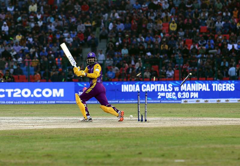 Yousuf Pathan’s middle stump uprooted during a LLC match between Bhilwara Kings and Urbanrisers Hyderabad at MA Stadium, Jammu on Friday. - Excelsior/Rakesh