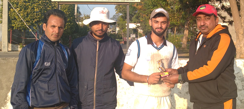 Dignitary of the event presenting man of match trophy to a player at Jammu on Wednesday.