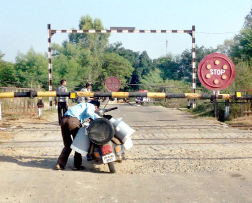 Risking life: A scooterist crosses railway track despite barrier near Samba on Sunday.     -Excelsior/Rakesh