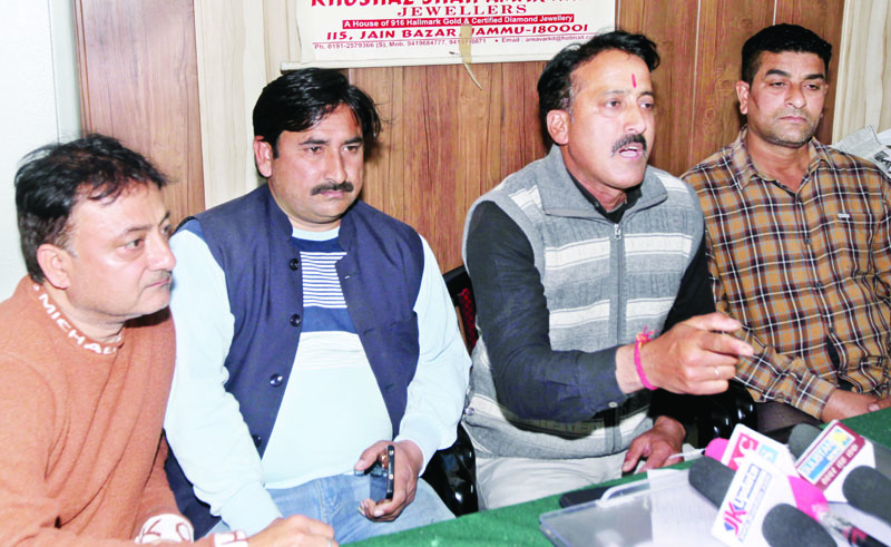 Senior members of PHE Workers United Front , Ravi Hans, Rajinder Singh Taj and others talking to media-persons outside Chief Engg’s office at BC Road in Jammu on Wednesday. - Excelsior/ Rakesh