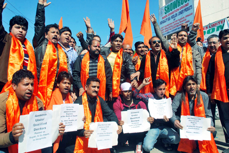 While addressing the demonstrators Rakesh Kak said that Ministers and bureaucrats have posted their blue eyed boys as the Medical Superintendents by throwing all rules to winds. These doctors are not possessing required qualifications to hold the posts, he added.