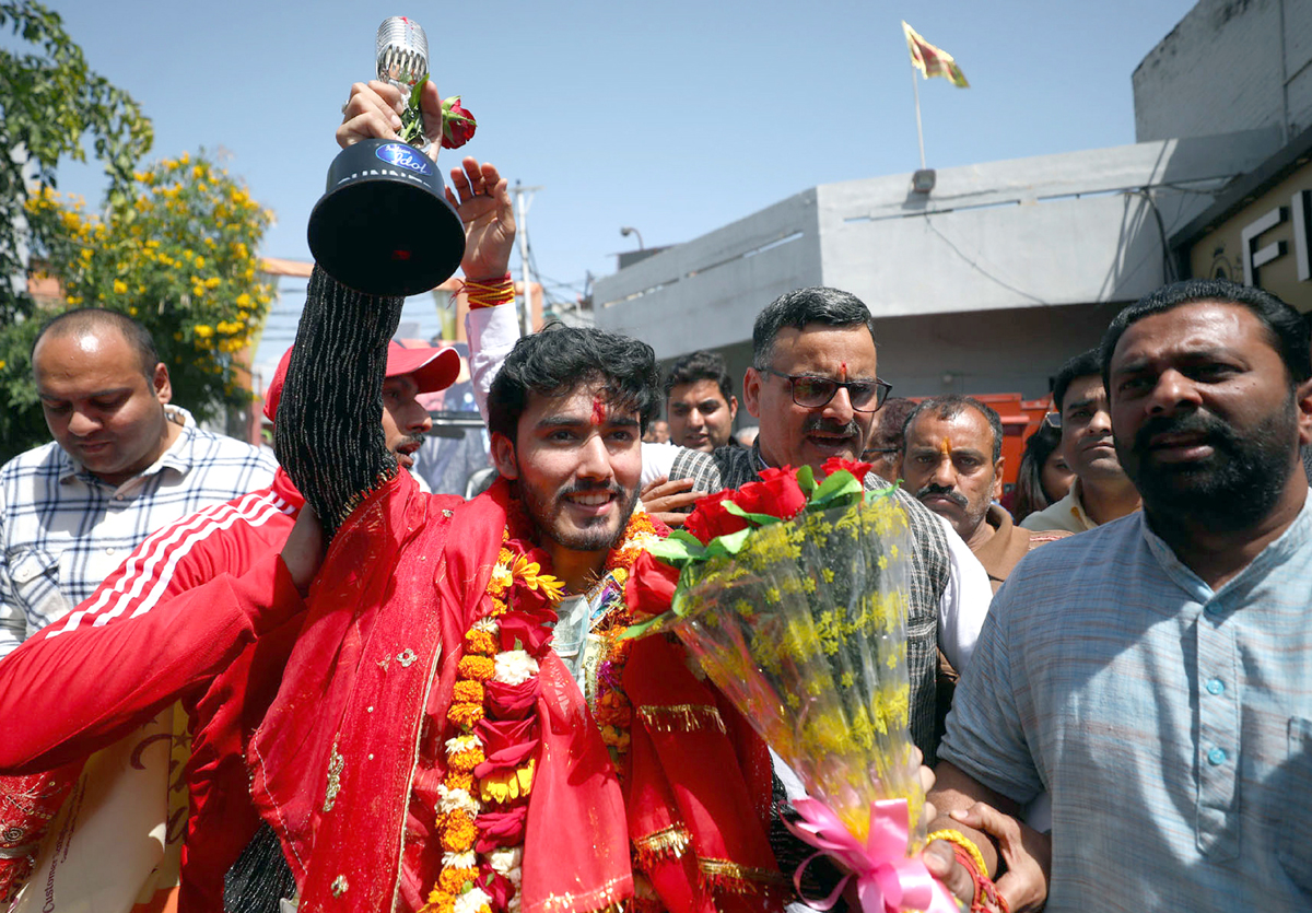 JAMMU, Apr 6: The runner up of Indian Idol, Chirag Kotwal today received a warm welcome by the people of Talab Tillo area here who were led by senior BJP leader, Sanjay Baru.