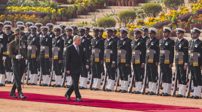 Russian President Vladimir Putin inspects a Guard of Honour during his ceremonial welcome at the Rashtrapati Bhavan, in New Delhi