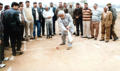 Ajay Sadhotra, Minister for Planning & Development, Labour & Employment executing a shot while inaugurating Cricket Tournament at Mandal in Jammu on Tuesday.