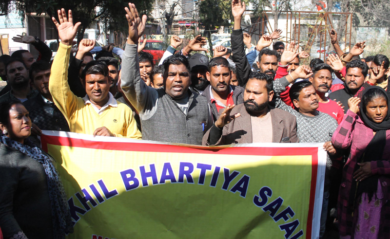 Safai Karamcharis protesting at Jammu on Friday.-Excelsior/Rakesh By Daily Excelsior - February 15, 2020 Share FacebookTwitterWhatsAppPinterestLinkedinCopy URLTelegramEmailTumblrReddItPrintKoo Safai Karamcharis protesting at Jammu on Friday. -Excelsior/Rakesh Safai Karamcharis protesting at Jammu on Friday.-Excelsior/Rakesh Follow our WhatsApp channel