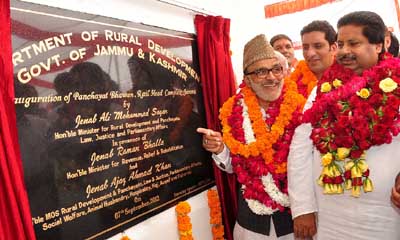 JAMMU, Sept 7: Minister for Rural Development, Panchayati Raj, Law, Justice and Parliamentary Affairs, Ali Mohammad Sagar, accompanied by Minister for Revenue, Relief and Rehabilitation Raman Bhalla and Minister of State for Rural Development, Panchayati Raj, Haj and Auqaf Ajaz Ahmed Khan on Friday inaugurated Panchayat Bhawan at Rail Head, Jammu.